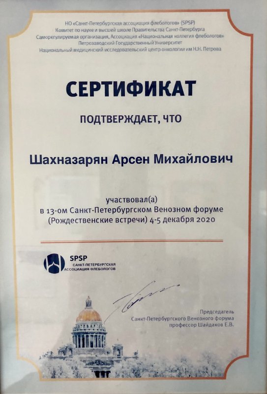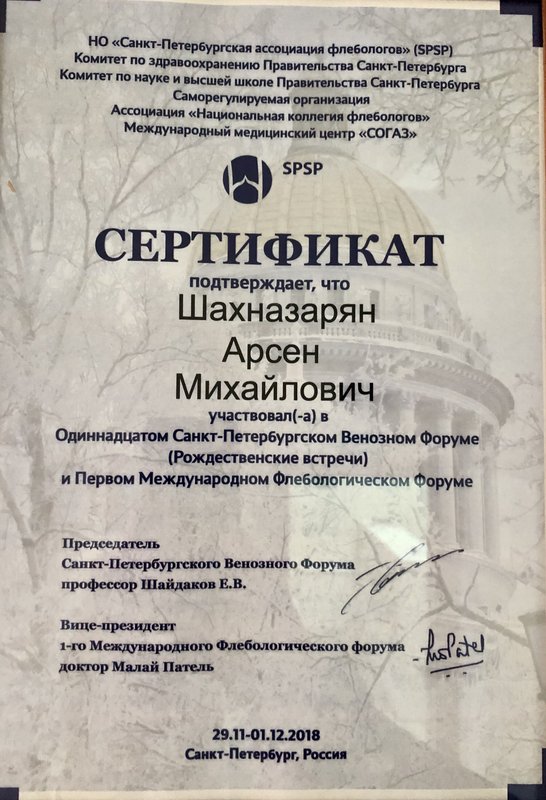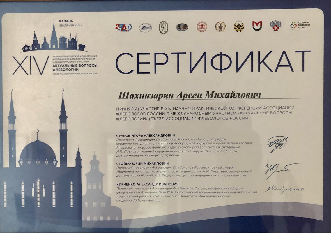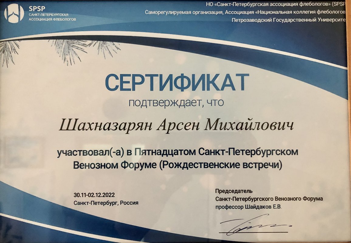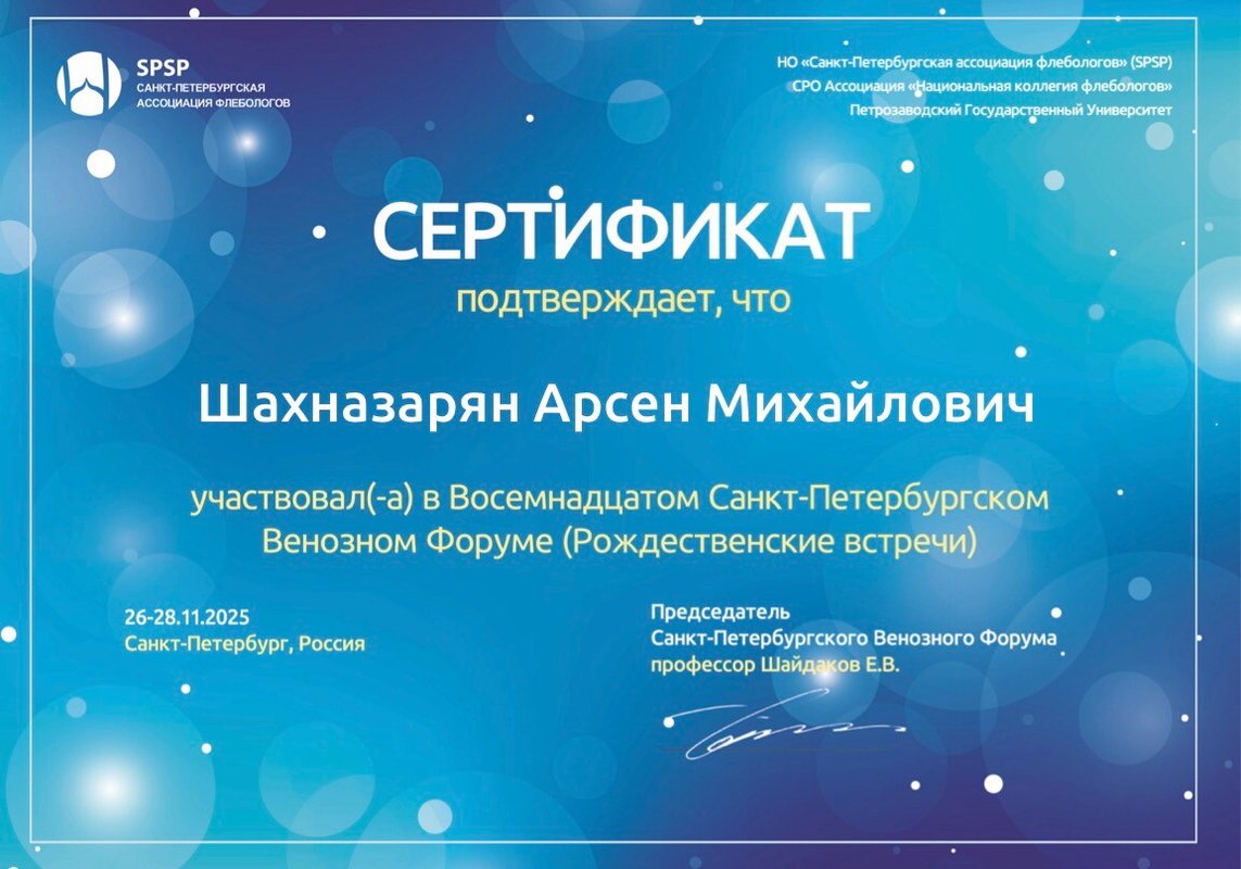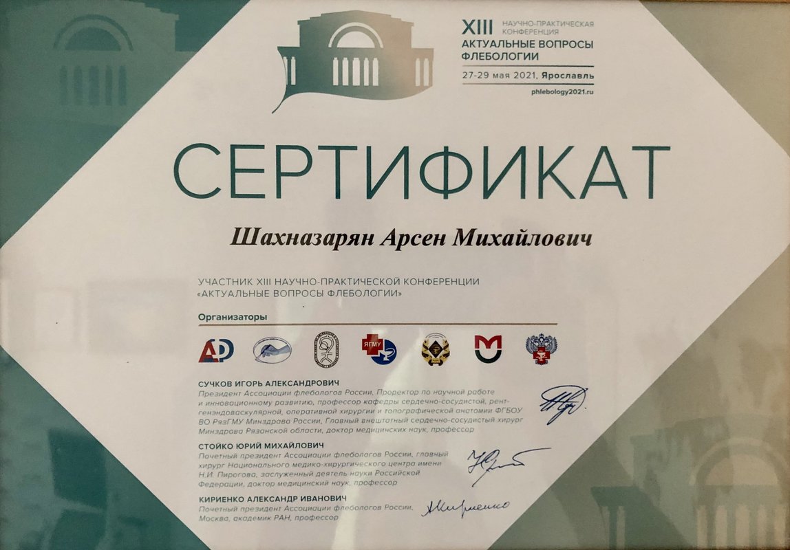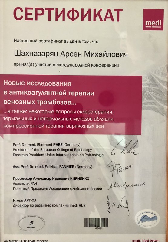 Доктор Арсен Михайлович Шахназарян проявил себя как настоящий профессионал: грамотно объяснил всё по заболеванию, ответил на вопросы доступно и подробно. Отдельно отмечу его доброе, внимательное отношение — чувствовала себя спокойно, как к пациенту должны относиться. Делали ещё УЗИ вен — всё прошло чётко и понятно.
